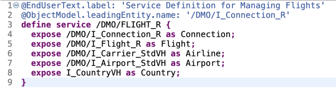 /DMO/FLIGHT_R 서비스 정의는 /DMO/I_Connection_R CDS 뷰를 OData 서비스에서 사용할 수 있도록 노출합니다.