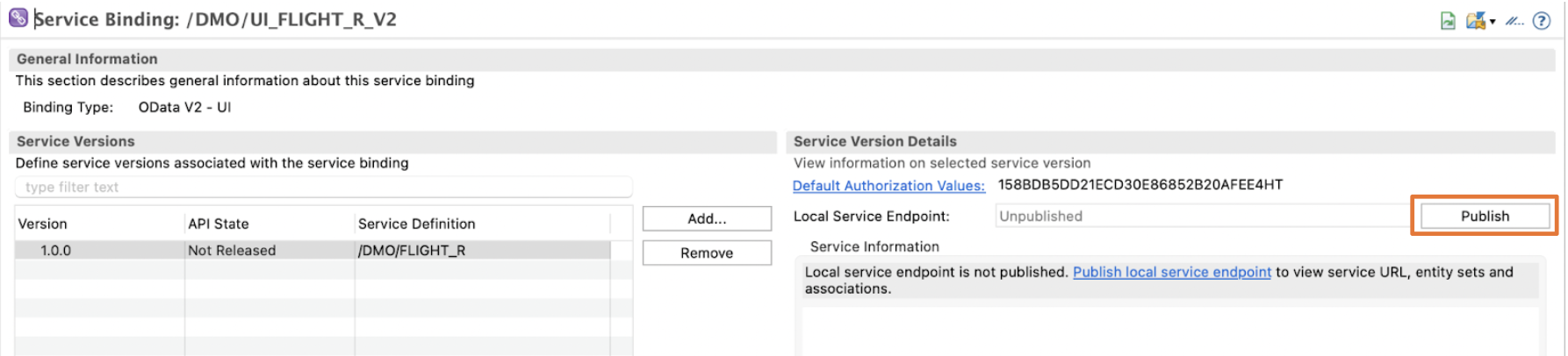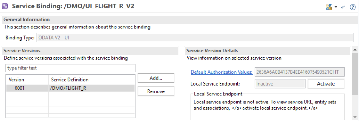 /DMO/FLIGHT_R)를 지정합니다. - 서비스 바인딩 편집기에서 설정을 검토하고, 바인딩을 활성화하여 UI에서 정상적으로 작동하도록 합니다.