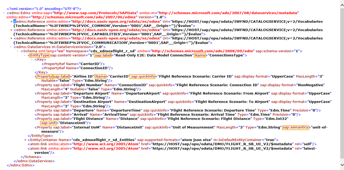 /$metadata추가:/sap/opu/odata/sap/DMO/UI_FLIGHT_R_V2/$metadata와 같이 URL 끝에/$metadata를 추가합니다. - 메타데이터 검토: 브라우저에서 메타데이터 문서를 열어 엔터티 세트와 서비스 정의가 정상적으로 노출되었는지 확인합니다.